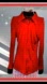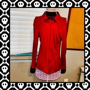 This vibrant vintage shirt by Jean Paul Gaultier features a smooth, glossy fabric in a striking black and red color combination. The standard pointed collar adds a polished touch to this fitted top, while the detachable black leather cuffs with silver detail add a 1990s edginess, synthetic, size 42 (US 6). Rare and collectible!