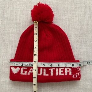 Jean Paul Gaultier red, knit ,cuffed, Pom Pom beanie hat