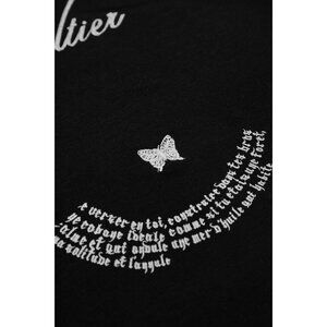This Jean Paul Gaultier T-shirt exemplifies modern artistry with its playful graphic design and unique butterfly details. Crafted from soft cotton material, it offers a comfortable fit while embracing the brand's signature avant-garde aesthetic. The text and graphic elements blend seamlessly to create a standout piece for the fashion-forward wardrobe.