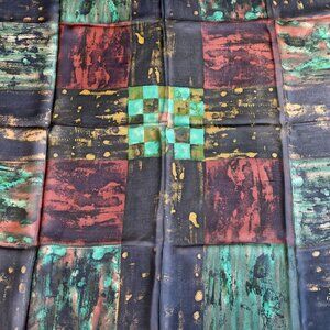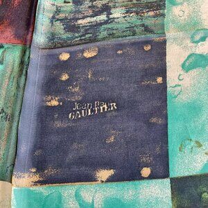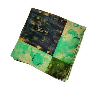 Elevate your collection with this rare Jean Paul Gaultier silk chiffon scarf, featuring an abstract painterly design in shades of green, gold, black, and rust. The bold pattern creates a striking visual effect, making it a standout accessory.