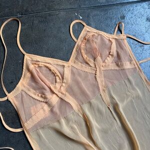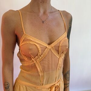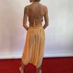 Can't believe this survived for 15+ years in perfect condition . super unique dress, very VERY long, you bring it up throughout the legs and tie it on your back . beautiful construction, very flowy like in India or something . perfect for a holiday vacation . can't really measure it because it's just so loose and long . the fabric has a wrinkled texture . cool strap details in the photos .