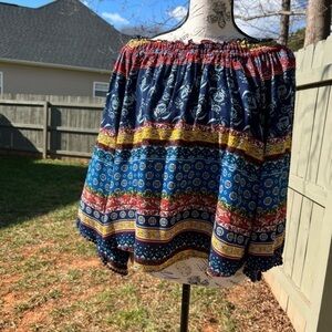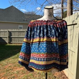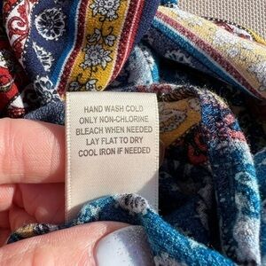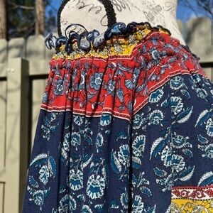 Blue, red and yellow are dominant colors. Flower pattern on min the background.