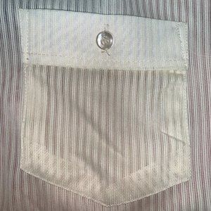 1960s Jean Phillipe pale yellow short sleeve striped mesh button-up with two front buttoned breast pockets and a straight collar. Original tags list size as an L. 100% Polyester