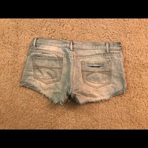 Distressed light jean shorts.