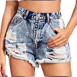 These acid washed jean shorts are distressed/destroyed in all the right places. A women’s size medium, they are tagged 4-5 and approximate measurements lying flat are waist: 14” rise: 12” inseam: 2 1/2”.