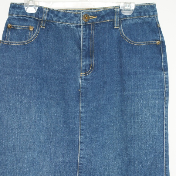 Lightly worn. Really cute jean skirt. Comes right below the knee. There is about a 2inch slit in the back.