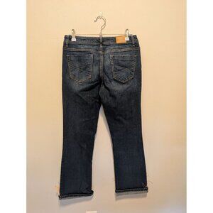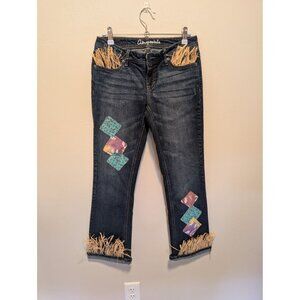 This pair of jeans offers a creative mix of fringe accents and patchwork designs, perfect for a bold and artistic look. Comfortable cotton blend material and bootcut style ensure versatility.