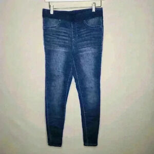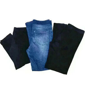 Jean and leggings bundle juniors medium (7-9). Includes 1 pair pull on skinny jeans, 1 pair full length black leggings, and 1 pair of black copped leggings. All in excellent pre-owned condition. No flaws.