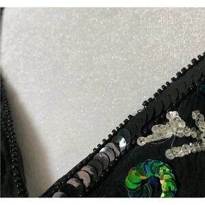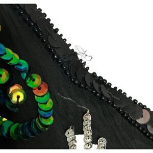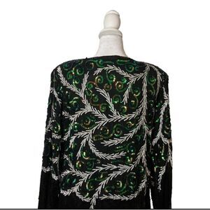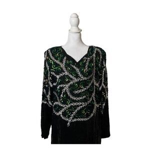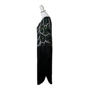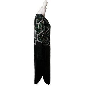 Joseph for Le Bon Vintage womens 100% silk evening style dress. Vneck with black, green, and silver swirl pattern sequins. Dry clean only. US size Large, please verify your measurements below,