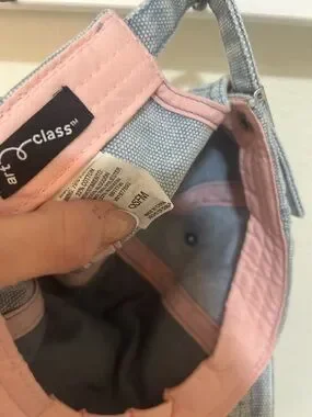 Soft pink trim with light blue canvas body. Adjustable strap at the back. Interior has sewn label. Simple casual style. Art class brand Jean hat