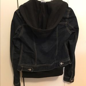 Dark zip up jean jacket with black hoodie on the inside