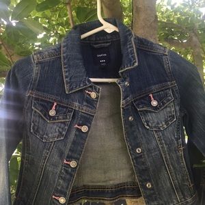 Jean Jacket by gap kids in size small. Never before used, but doesn't have the tag. Pink and yellow stitching. Button down the front.
