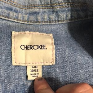 Jean jacket. I’m typically a small but this is a child’s 10/12 and it fits