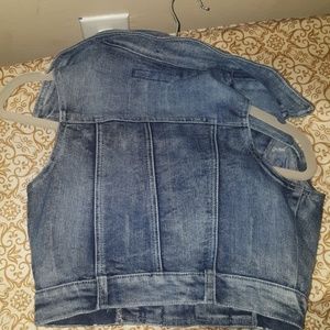 Ligh color jean jacket. Sleeveless. Zipper pockets