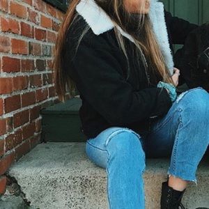 This jacket is so cute can be layered on top of anything and has a super soft inside. Size S/M (also have one in black if interested)