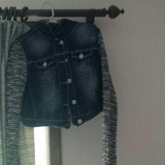 Blue denim jacket with black and white striped sweater sleeves in excellent shape.