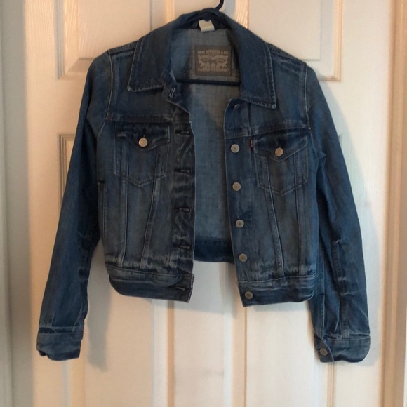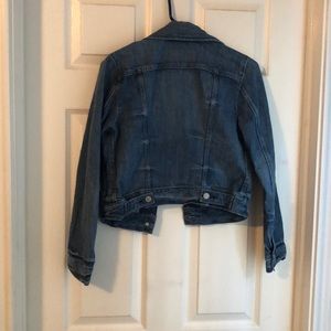 Medium wash jean jacket with front pockets. It has buttons on the pockets, sleeves, down the front, and with accents on the back. Barley worn, in perfect condition.