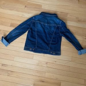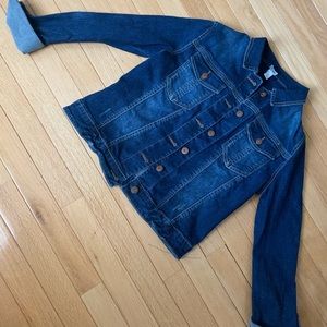 Jean jacket lightly worn. No signs of wear. Some areas on the coat are distressed but that’s the style of it!