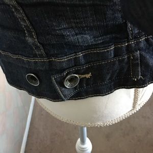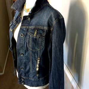 Fabulous Jean jacket, button sleeve, but in the waist line, button up the front, trimmed at the back of the collar, and on the pockets with multi color fabric. 19 inches from armpit to armpit. 22 inches from shoulder to hem line free gift with this purchase smoke-free environment fast shipping.
