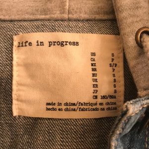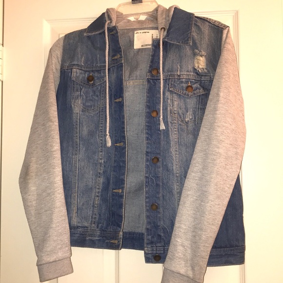 The perfect jacket! Jean jacket with fabric sleeves and hood! Little distressed areas for some character! This was my fav go to jacket for going out!