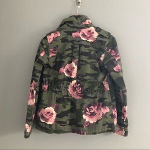 Pink flowers and green camouflage jean jacket and never worn