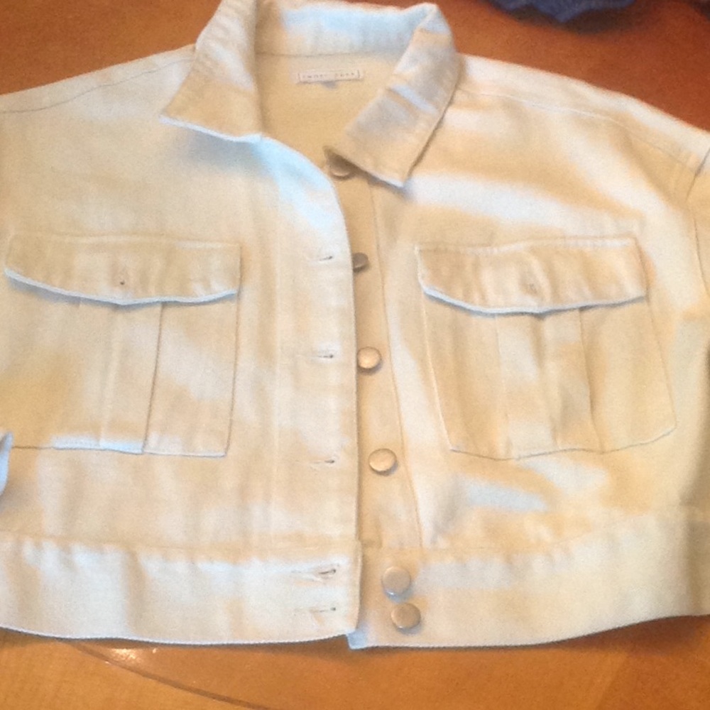 Off white, short jean jacket. Super comfortable, two pockets on chest. Button closure. Long sleeve. Like new