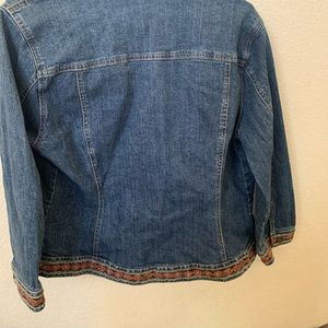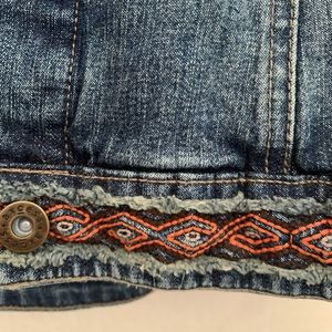 Dark wash jean jacket with a embroidered pattern at the bottom of the sleeves and jacket