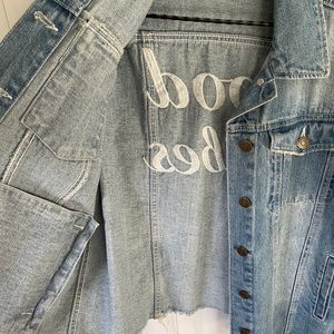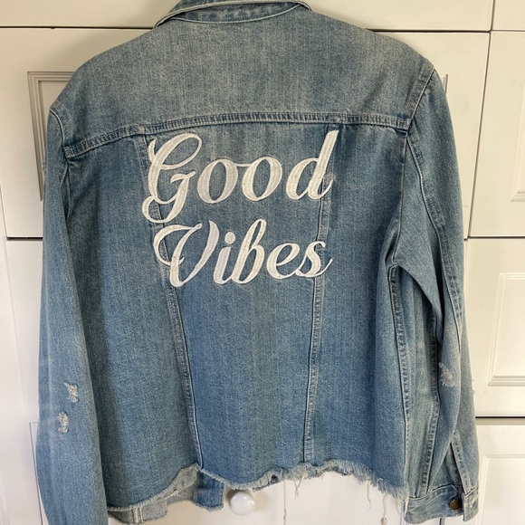 Light wash slightly distressed Jean jacket. “Good vibes” embroidered on back. Barely worn, great condition.