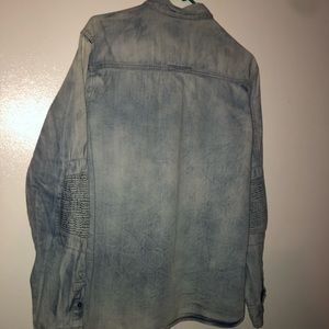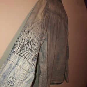 Price is negotiable! Large Jean jacket! Light toned jean color with distress in cloth. Designs on elbows. Barely worn, just like new!