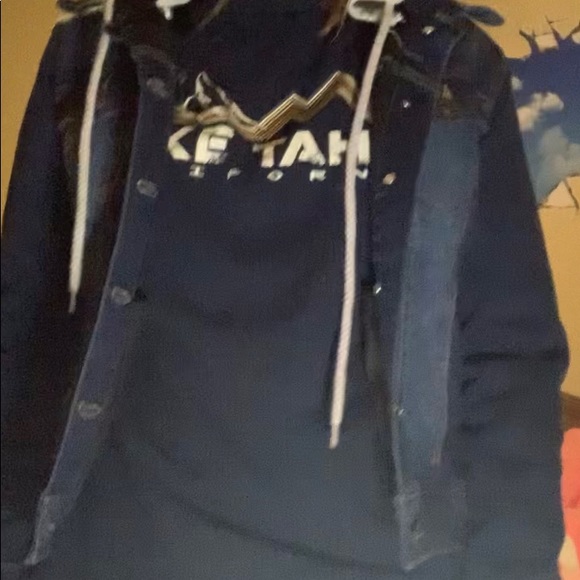 Dark blue Jean jacket with gray hood