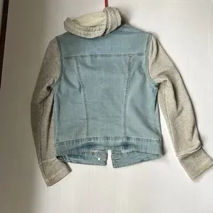 Womens jean jacket, size small. Gray striped sleeves. Good condition!