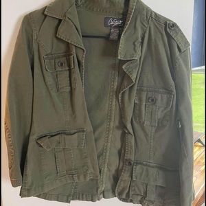 Army green Jean jacket. Sleeves go halfway up the forearm. Not stretchy.