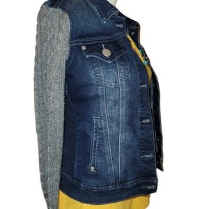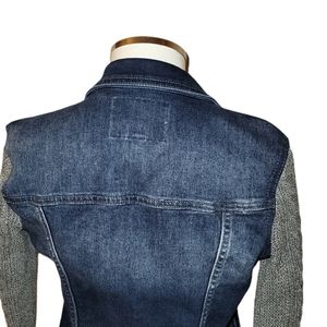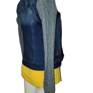 Express blue jean jacket with gray knit long sleeves in good condition size XS