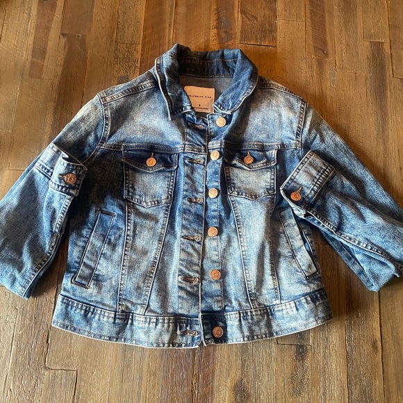 Size small, Jean jacket. Has rose golden buttons. VERY stretchy. It is a bit of a shorter Jean jacket