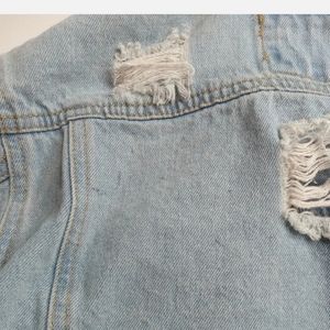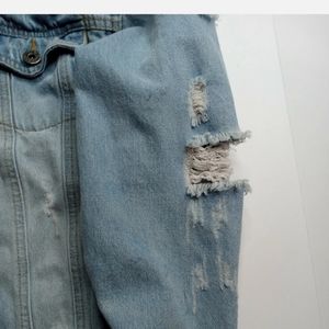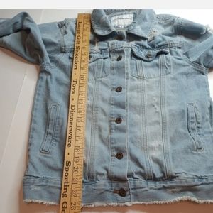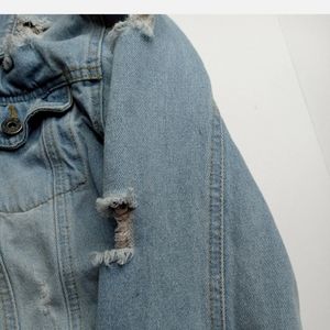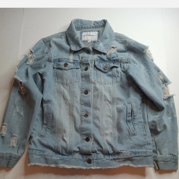 The Style Between Us Destroyed Distressed Denim Jeans Women Jacket Thrashed Sz S. There are some stains on the jacket see photos above.