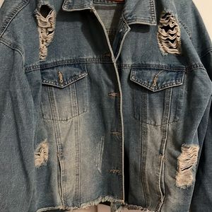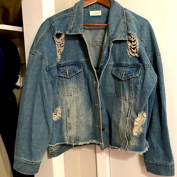 Distressed jean jacket. Labels M but I think this is a L or XL