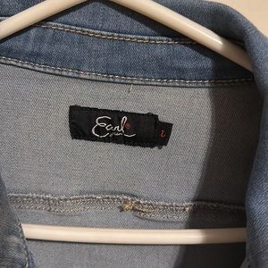Jean jacket size Large. This is a shorter fit. Stretchy and soft… very comfortable. Smoke free home