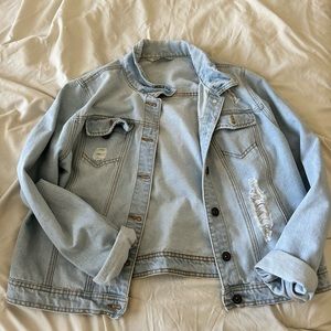 Light blue denim jean jacket with distressing. Size XL, feels large- XL. Has pink marker spot on back left shoulder (pictured in second picture)