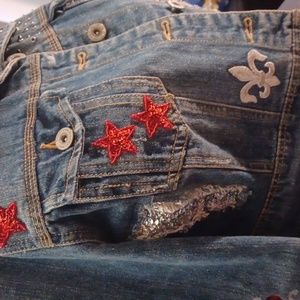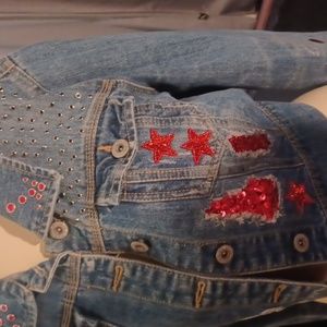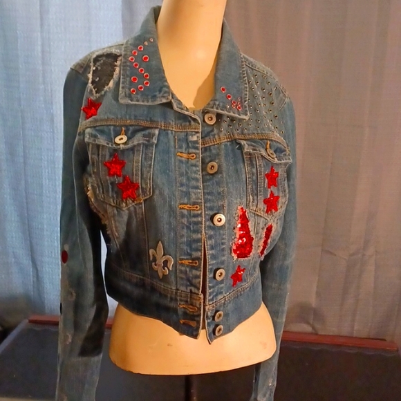 Highway denim jacket embellishments in red, silver and black