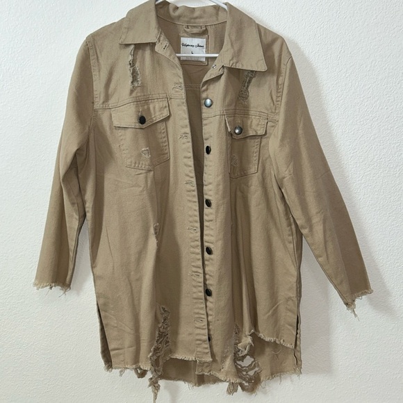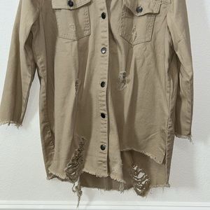 New never worn. Jean jacket, ripped and distressed style. Longer dress length. Smoke and pet free home.