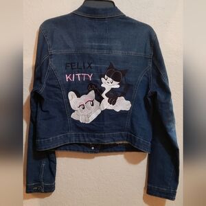 Lightweight Jean jacket side pockets with sweet embroidery detail on the back of "Felix the cat" and his girlfriend miss kitty..