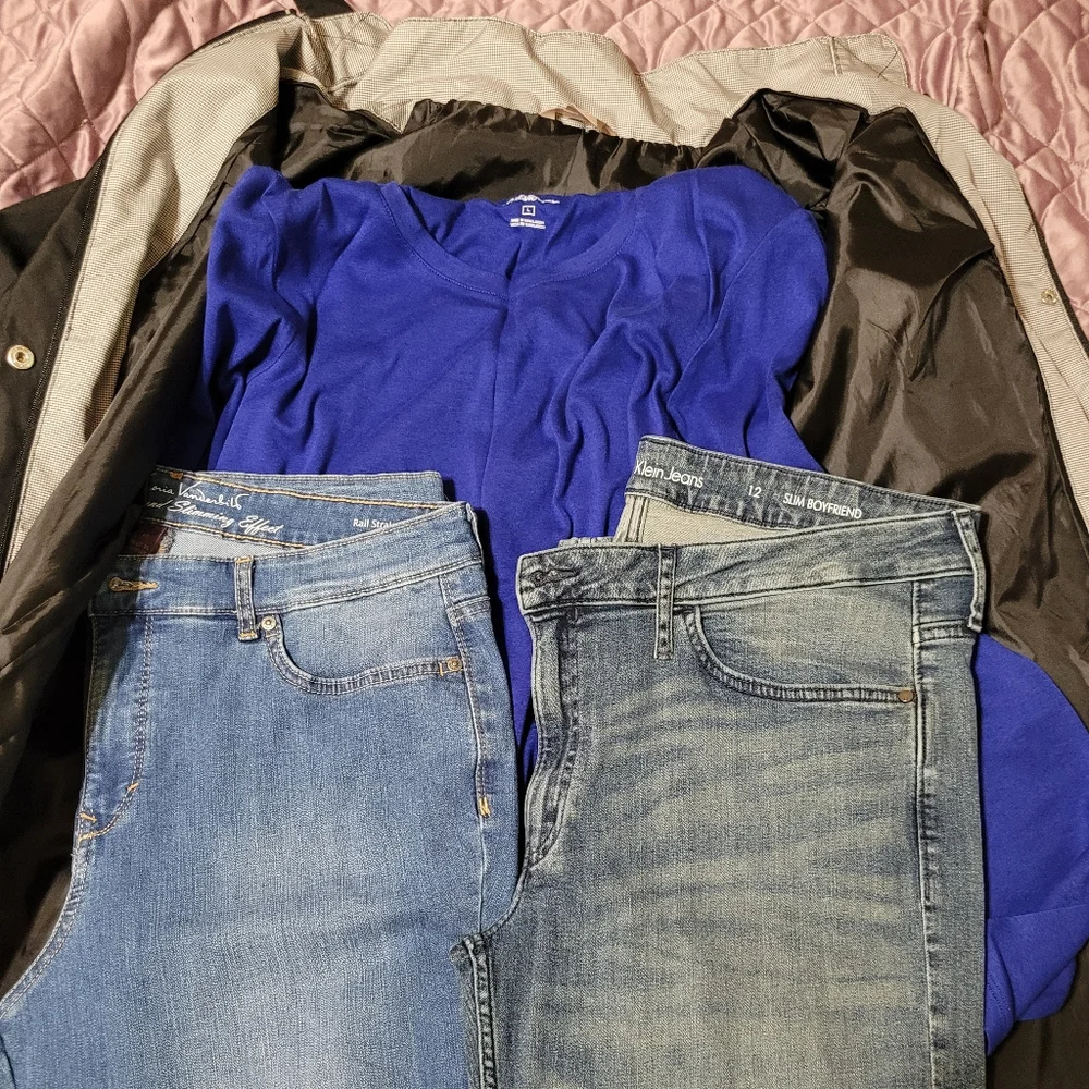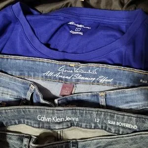black large white stag jacket with hood,blue Eddie Bauer long sleeve shirt, size 12 Calvin Klein slim boyfriend cut blue jeans, size 12 Gloria Vanderbilt rail straight blue jeans