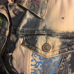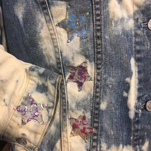 Acid washed jean jacket with rainbow leopard appliqués applied and sprinkled with eye-catching rhinestones. Size stretchy L 21” pit to pit 18” sleeve length from pit to cuff 24” collar to bottom of jacket length.