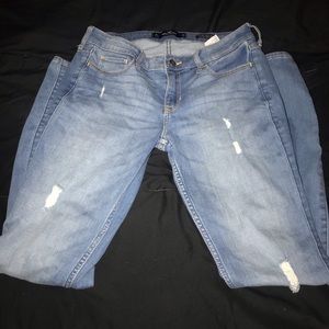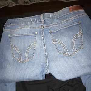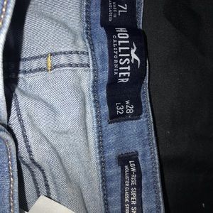 The first pair is Refuge jeans. They’re like boyfriend jeans/mom jeans with rips in the front and back. Size 8. The second pair is Holister jeans that are low rose size 7L, W28 & L32.