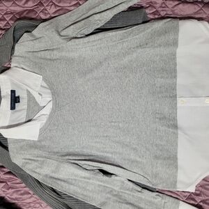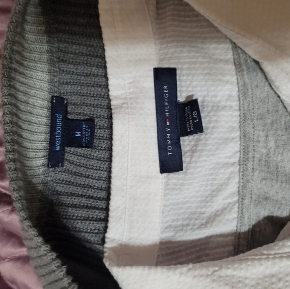 large Tommy Hilfiger grey and white long sleeve shirt, medium gray westbound sweater vest, Gloria Vanderbilt size 14 straight leg gray jeans and time and true size 14 boot cut blue jeans