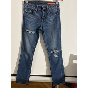 Stylish distressed blue jeans perfect for casual outings. Comfortable fit with a trendy look. Rise 9.5” inseam 29”