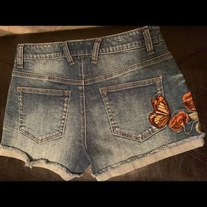 Jean shorts with roses and butterflies. New without tag’s. Size 5, Waist is 14 1/4 inches across, with a 3 inch zipper. Super cute shorts.