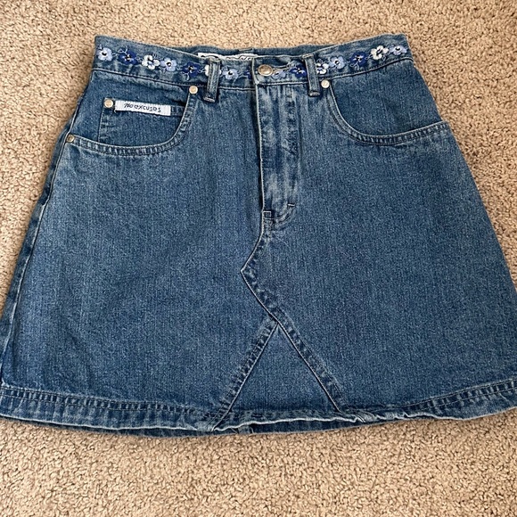 Denim jeans skirt in great condition. Has blue flower details. Fits a size 4 as well. Vintage