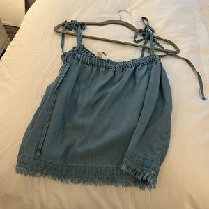 Jean look tank top. Super flattering. Cute tie straps and fringe bottom.