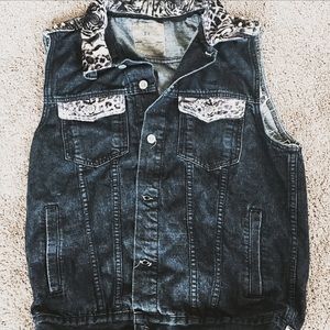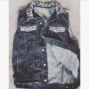 Black jean vest with spikes along the shoulder. Grey leopard and spikes around collar and on pocket flaps.